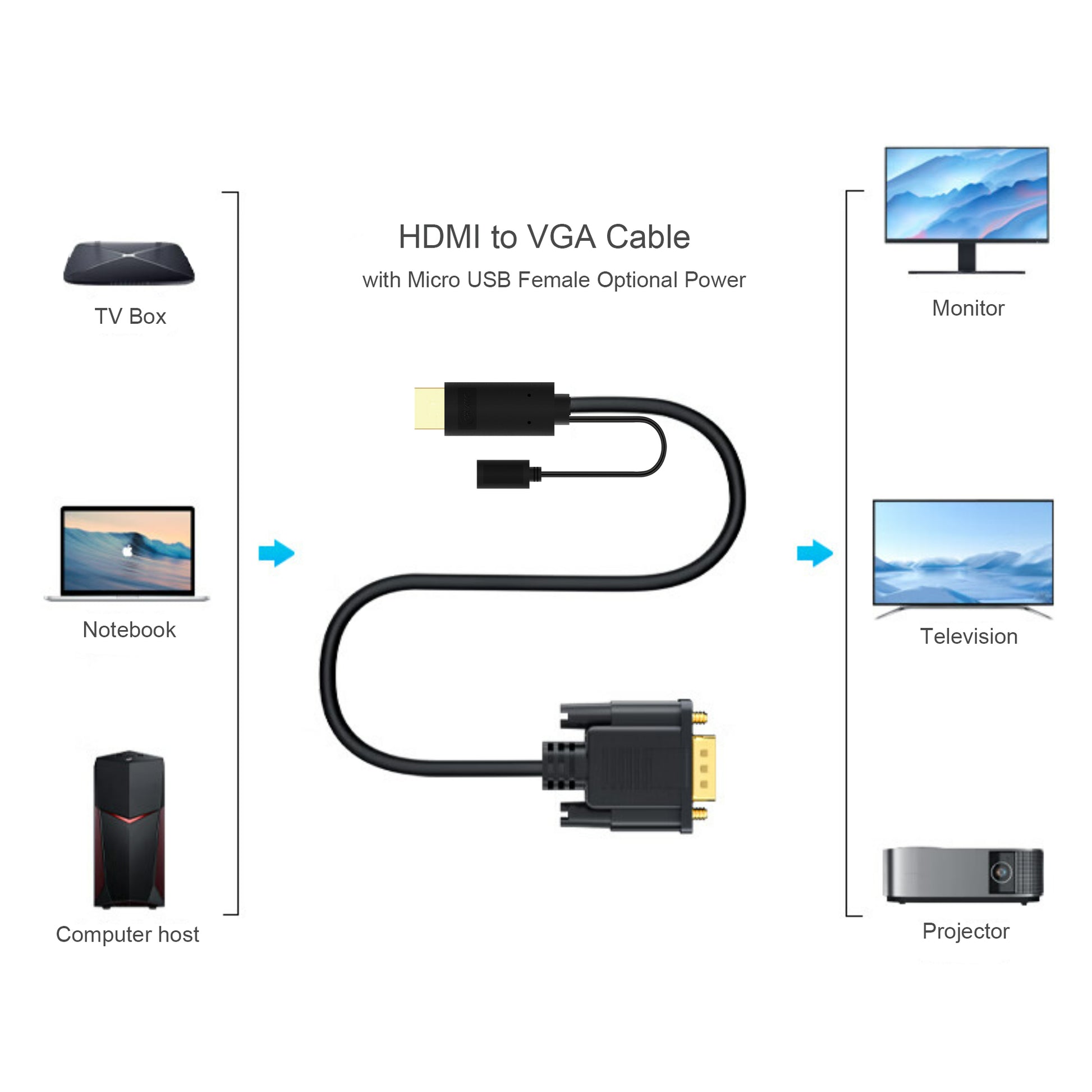 Connects your HDMI equipped device to a VGA monitor or projector
