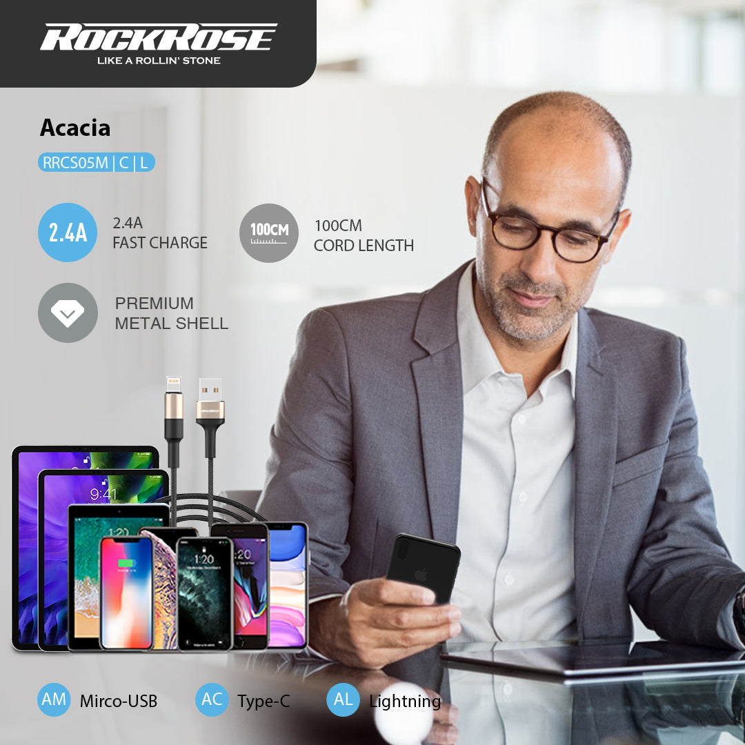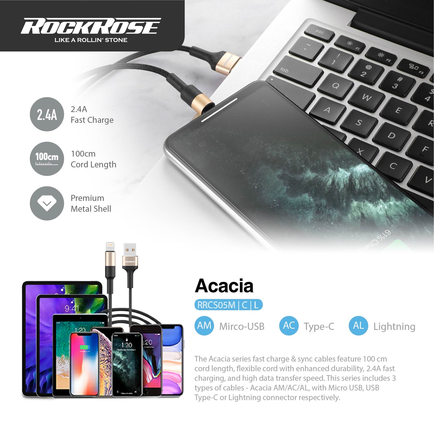 Rockrose Acacia AC 1m 2.4A Nylon Braided USB-C Charge & Sync Cable