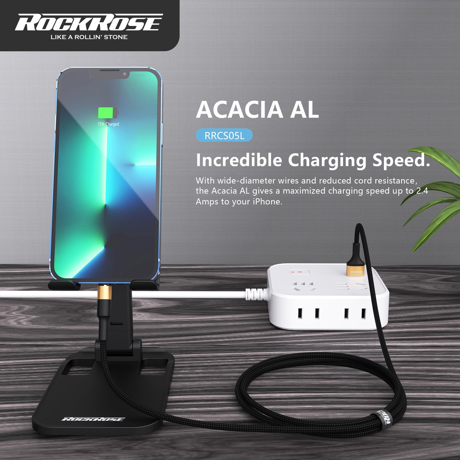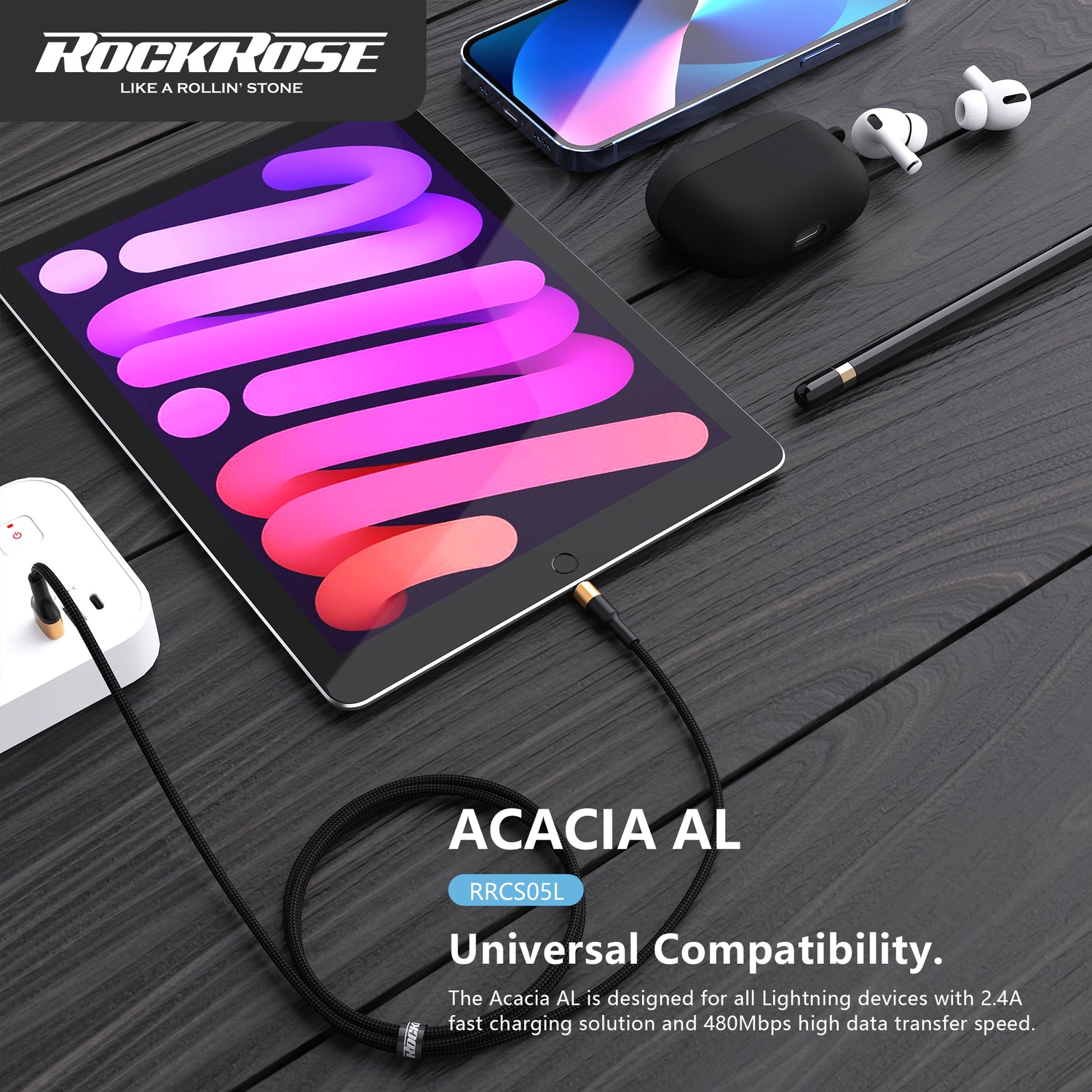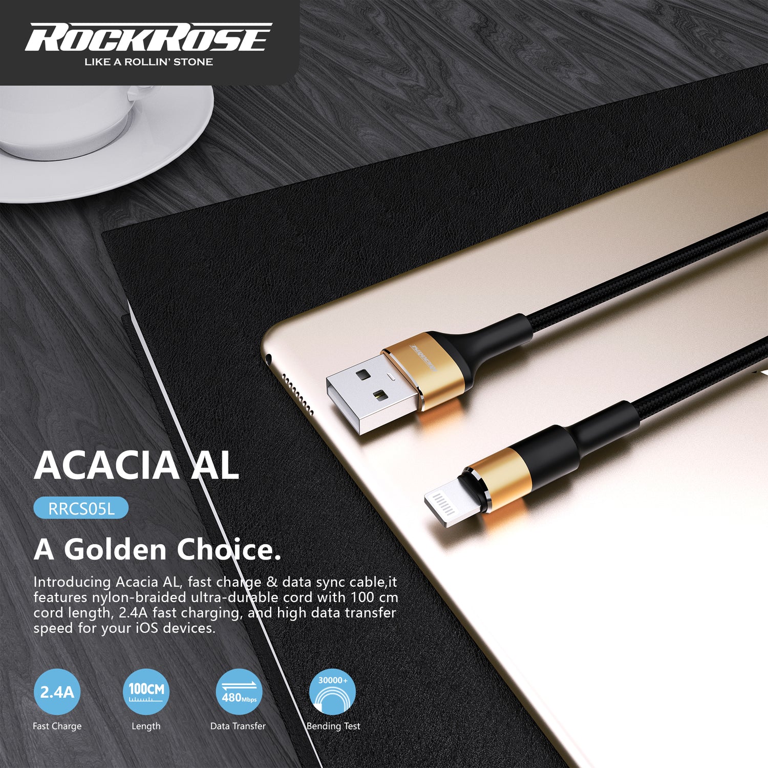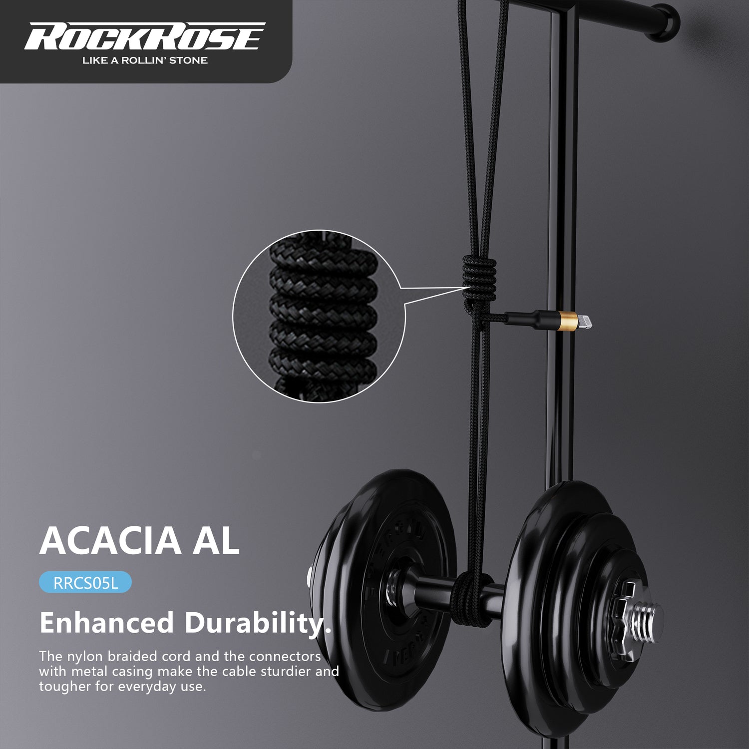 Rockrose Acacia AL 1m 2.4A Nylon Braided Lightning to USB Charge & Sync Cable
