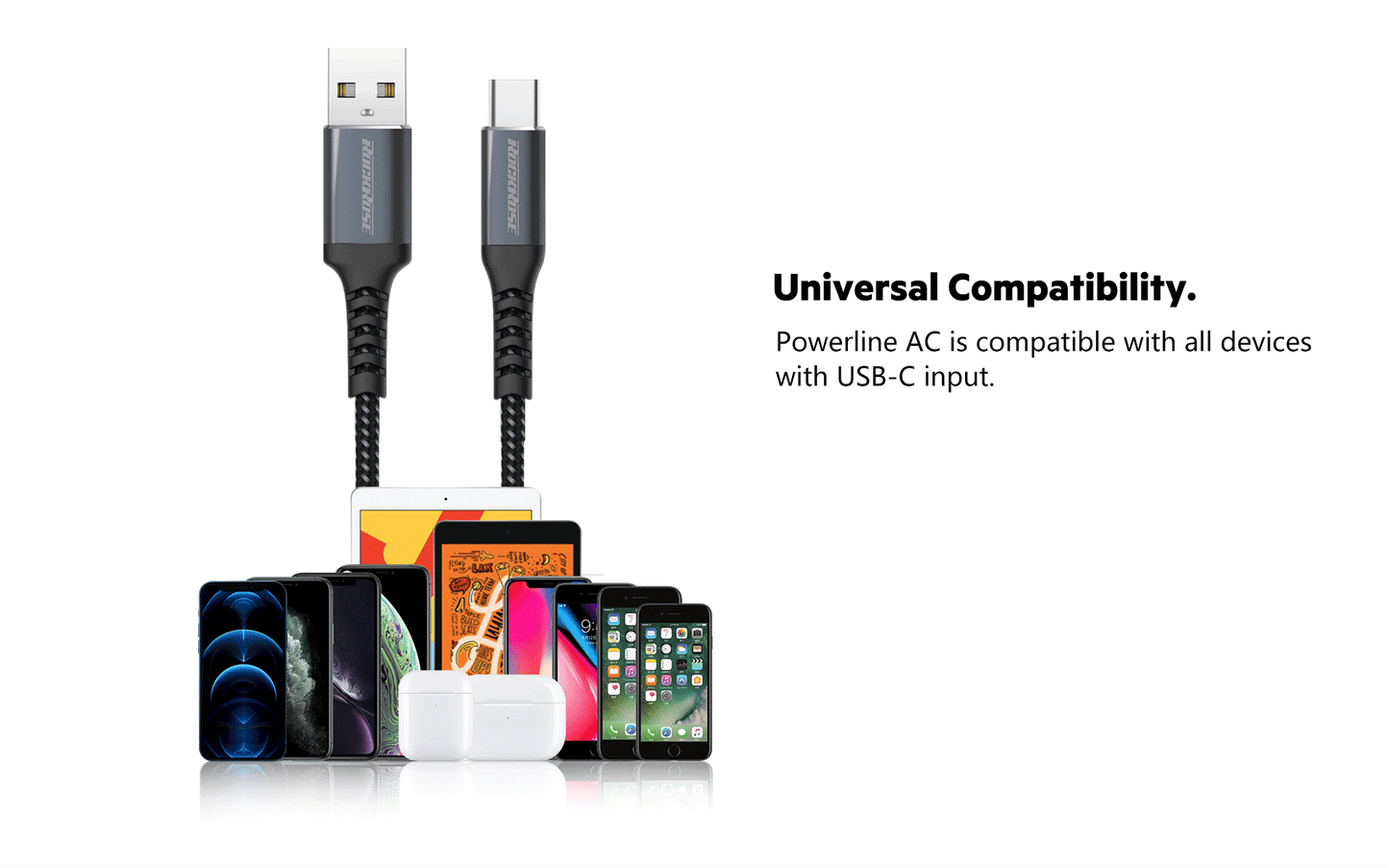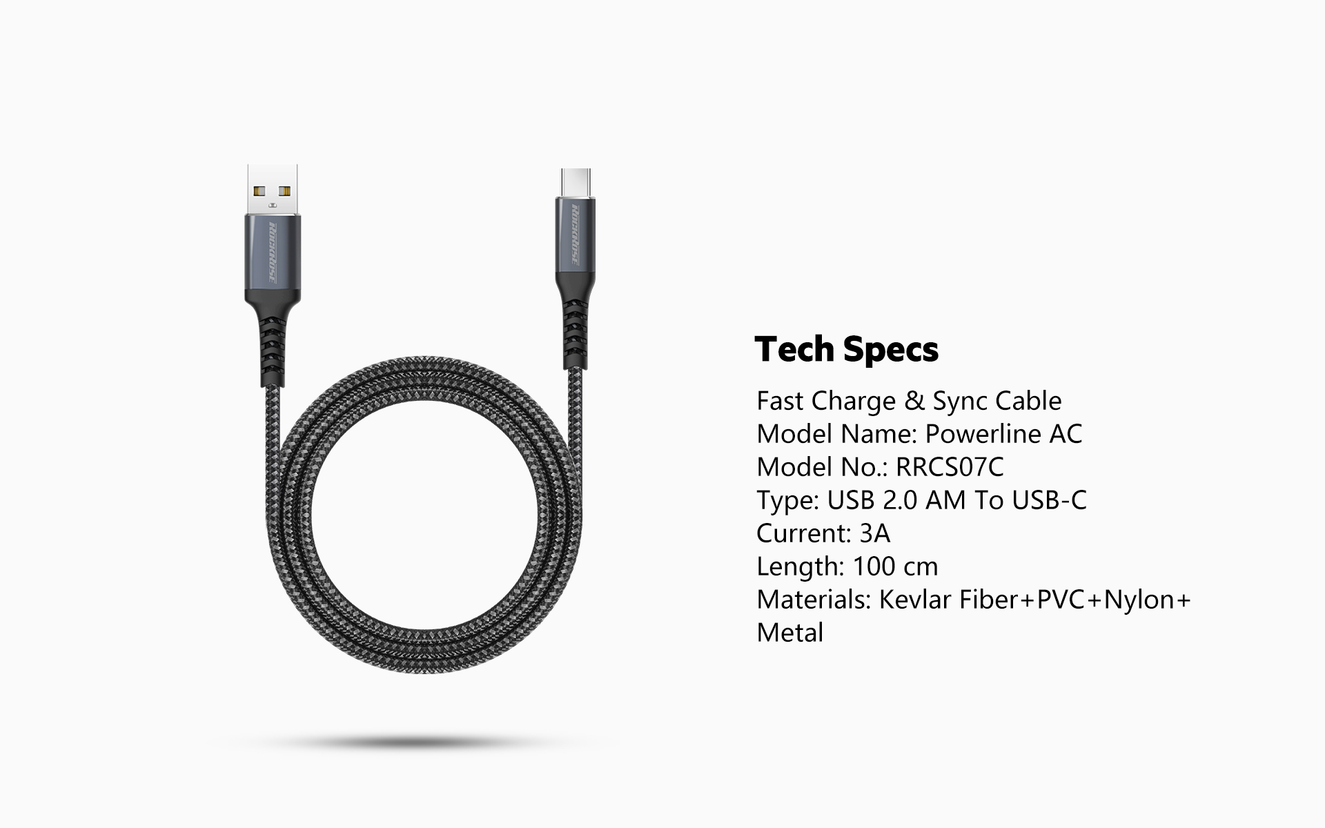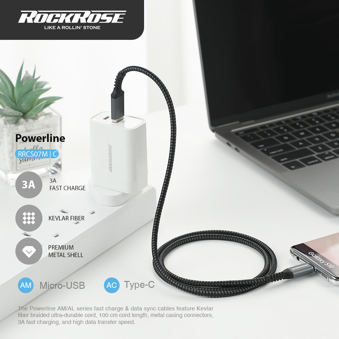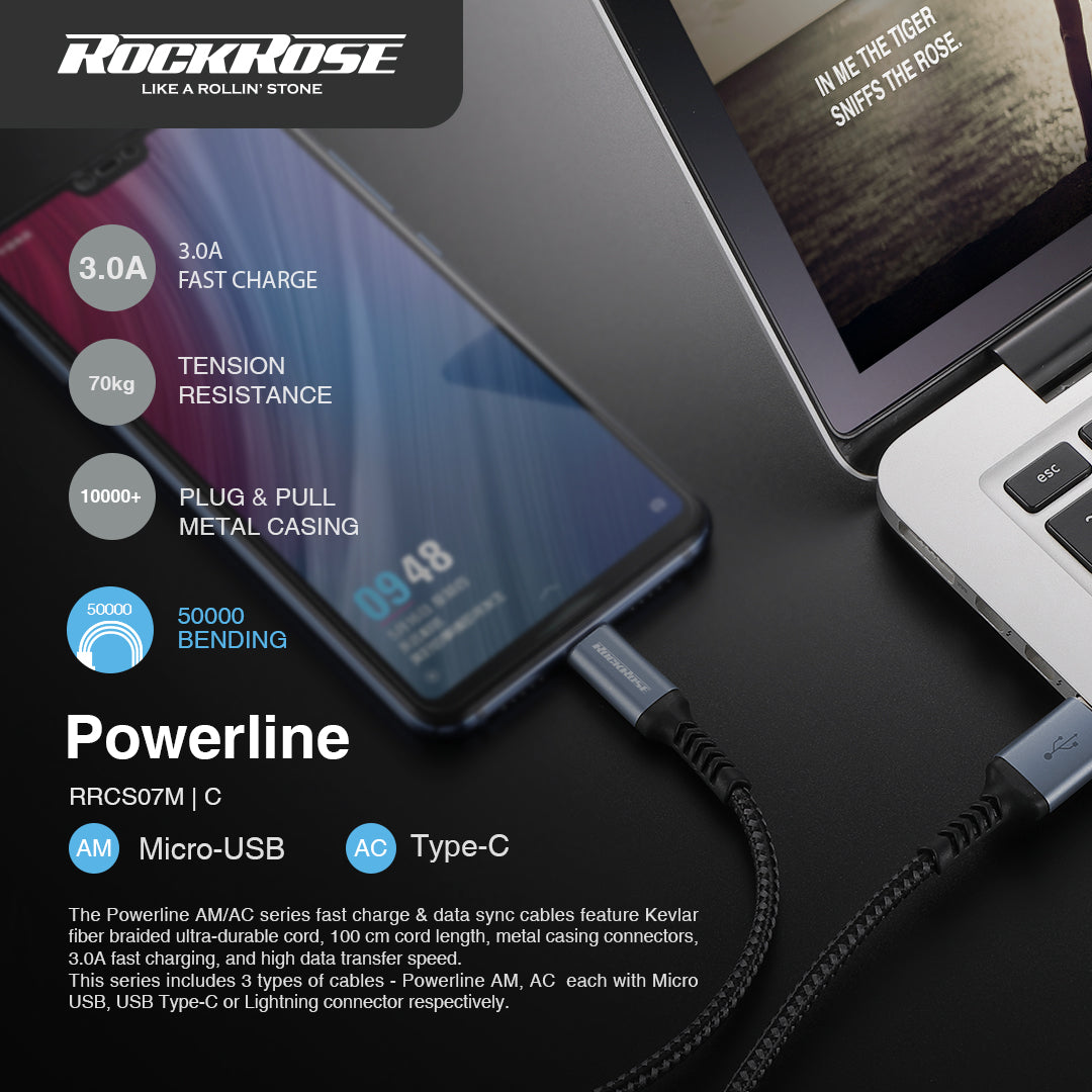 Rockrose Powerline AC 3A 1M USB-C Fast Charge & Data Sync Cable